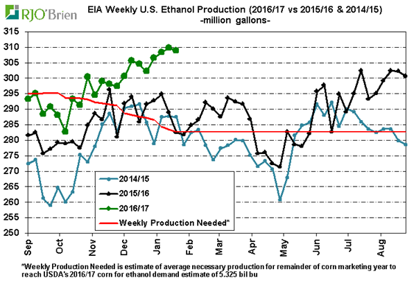 Cependant, les inventaires d’éthanol ont bondit de 613,000 barils ce qui indique que la production actuelle est un peu trop élevée face à la demande de gazoline qui a reculé. Ça fait tout de même parti de la saisonnalité des inventaires d’augmenter en janvier/février, mais le déficit comparativement à 2015/16 est maintenant effacé.