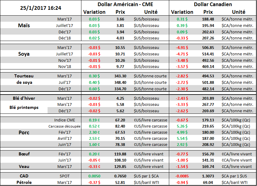 Avec l’arrivée du nouveau Président Trump ainsi que l’implémentation rapide de son plan économique/politique, la bourse américaine maintient sa tendance haussière des dernières semaines et fracasse les records. L’indice Dow Jones a terminé la journée au-dessus de 20,000 ce qui était un niveau très surveillé par les médias. De plus, les indices S&P500 et Nasdaq ont aussi fini la séance d’aujourd’hui à des niveaux record. Évidemment, le fait que l’administration Trump veut diminuer les charges d’impôt des entreprises en plus d’investir en infrastructure, les compagnies américaines bénéficieront de ce stimulus financier ce qui donne du gaz à la valeur boursière des entreprises. Cependant, avec l’économie américaine qui est déjà au plein emploi avec un taux de chômage à seulement 4.7%, il y a toujours un risque que l’économie surchauffe dans quelques années, amenant de l’inflation ainsi que des hausses de taux d’intérêt… D’où la force du dollar américain depuis les élections. Pour plus de détail, notre collègue Patrice Odo discutera du sujet à RDI Économie, ce soir à 18h30.