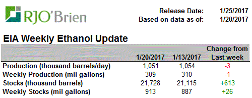 Pour la semaine terminant le 20 janvier, la production d’éthanol a légèrement reculé à 1.051 million de barils par jour (309 M gallons/semaine), mais ce qui est le plus important à retenir c’est que la production est 9.4% au-dessus de l’an dernier. Pour les 6 dernières semaines, la production américaine d’éthanol était en moyenne 6.0% de plus que l’an dernier. Basé sur ces chiffres impressionnants de production, l’estimé de l’USDA de 5.325 milliards de boisseaux de maïs est rendu clairement trop bas. Avec le volume déjà produit depuis le 1er septembre, il faudrait que la production soit 2% de moins que l’an dernier jusqu’en août pour ne pas dépasser la cible de l’USDA. Même en ajoutant 100 millions de boisseaux, il faudrait que la production soit seulement 1% de plus que l’an dernier, alors que nous roulons à +6% depuis plusieurs semaines. De façon réaliste, on pourrait déjà attribuer une consommation de 100 à 150 millions de boisseaux de plus que le bilan de l’USDA pour le maïs, démontrant encore une fois la forte demande provoquée par les faibles prix.