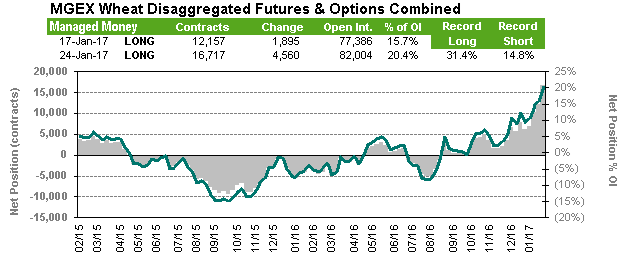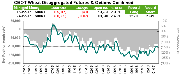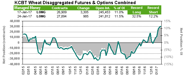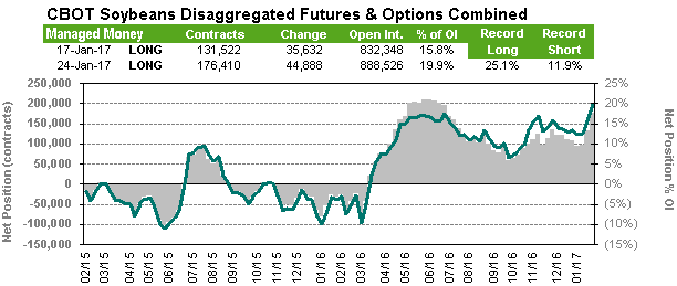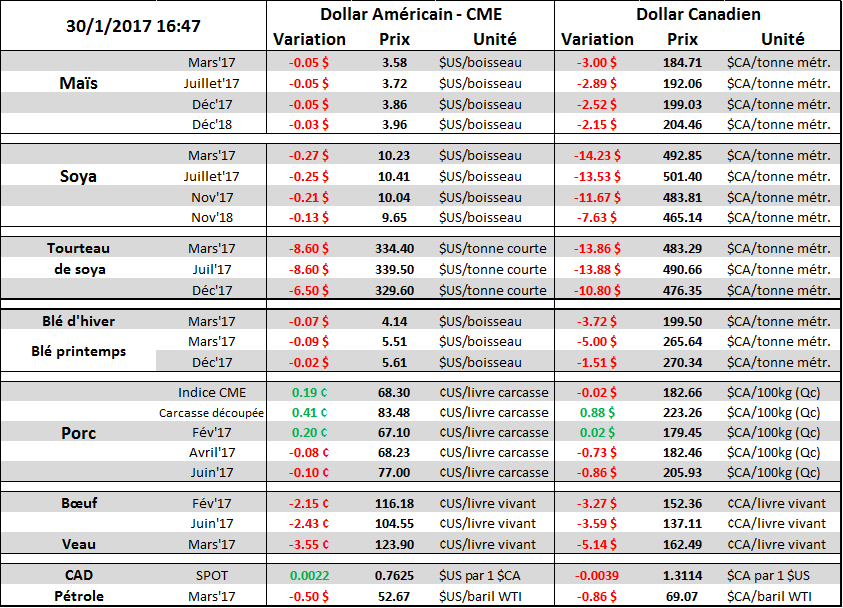 Position des spéculateurs (CFTC Commitment of Traders) : changement de cap pour le maïs alors qu’on est de retour à une position longue de la part des spéculateurs pour une première fois depuis la mi-juillet. Un total de 72,283 contrats ont été achetés pour porter leur position nette à 20,898 en date du 24 janvier. Beaucoup d’achat également au niveau du soja alors que les spéculateurs ont maintenant 20% des CàT existants (open interest). Ça représente un niveau qui n’a pas été atteint depuis plus de 2 ans. La position longue nette des spéculateurs est maintenant de 176,410 contrats. Les spéculateurs ont toujours une position vendeur sur le blé de Chicago qui constitue 15% des CàT existants. Le blé du Kansas et de Minneapolis attire plus les spéculateurs alors que leur position nette longue est de 27,894 (12%) et de 16,717 (20%) respectivement.