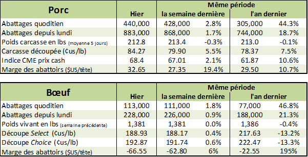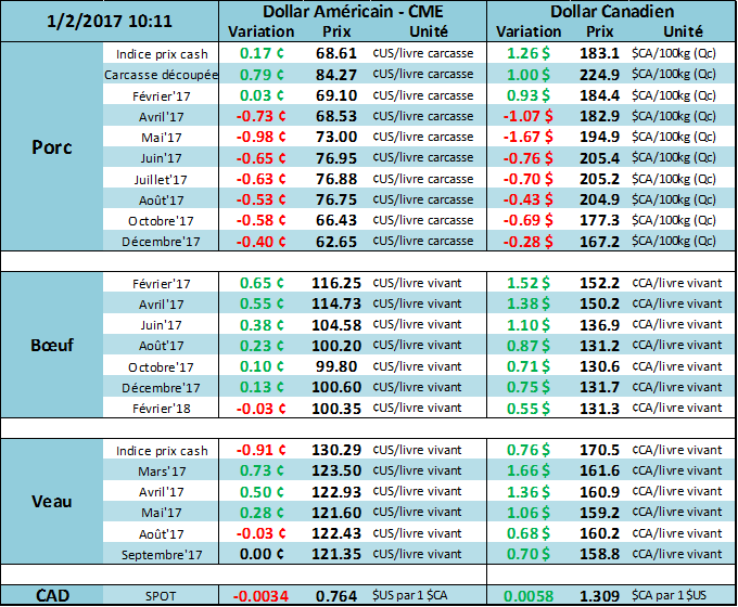Tel que mentionné dans l'Agro-Lettre d'hier, le données venant du rapport sur l’inventaire du Cattle d’hier nous montrent un cheptel bovin américain plus gros qu’anticipé. Une des statistiques qui a été la plus surprenant est le nombre de génisses de 500 lbs et plus qui servent au remplacement des vaches-veau. On s’attendait à une baisse de production pour 2017 et finalement, c’est une hausse de production qui s’annonce alors qu’on a 1.25% de génisses qui mettront bas. C’est donc une 6e année consécutif avec une augmentation du nombre de génisses gardées pour la reproduction. Un coup les chiffres publiés, la question qui se pose toujours est à savoir si le marché avait déjà absorbé une partie de la nouvelle. On sait que les CàT de bœuf avaient diminué dans les derniers jours suite au rapport Cattle-on-feed de vendredi, mais est-ce que le rapport d’hier viendra peser encore plus lourdement sur les prix? Il semblerait que oui, les prix d’ouverture de ce matin bougent très peu jusqu’à maintenant sur les marchés, les CàT de février a ouvert à 115.40¢/lb, avril à 113.825¢/lb et juin à 103.95. Les prix des découpes étaient de 192.87¢/lb (-0.48) pour le Choice et 188.93 (0.00) pour le Select. Les CàT du veau d’embouche étaient à la baisse hier alors que le contrat de mars a terminé la journée à 122.78¢/lb (-1.12) et celui d’avril à 122.43¢/lb (-1.12).