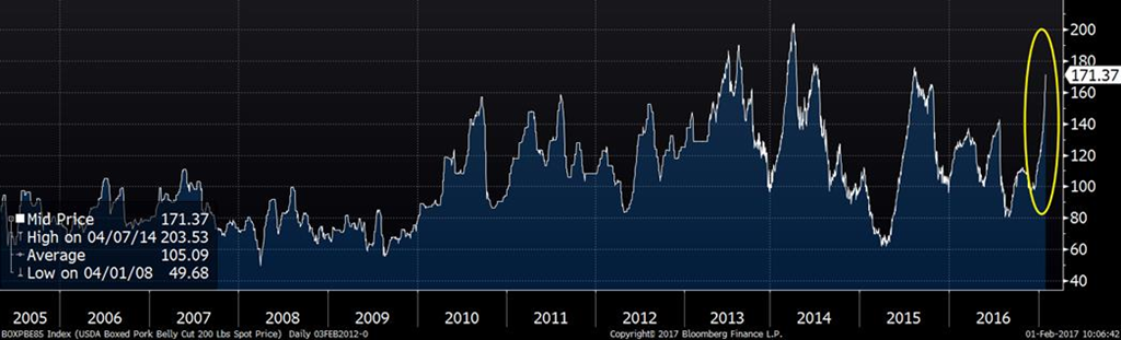 Le prix du porc est assez fort en raison du prix de la découpe encore une fois. On a enregistré un gain de 0.79 pour atteindre 84.27¢/lb sur les découpes globales et le gain est particulièrement fort grâce au bacon (voir le graphique suivant). Le prix du flanc de porc a explosé de 70% ces 6 dernières semaines, s’approchant du sommet historique de 200 ¢US/lb établit en 2014. L’indice CME en date d’hier se trouvait à 68.61 (+0.17), soit 12% plus élevé qu’à pareille date l’an dernier. La monté se poursuit depuis le rapport Cold Storage qui nous indiquait moins de stocks de surgelés et du même coup une forte demande. Le CàT de février a pris +1.97 ¢/lb hier sur la journée. L’ouverture s’était fait à la hausse ce matin, mais la tendance a vite changé puisque tous les mois sont négatifs (à 10h10) sauf février. Les prix d’ouverture était de 69.50¢/lb sur février, 69.525¢/lb sur avril et 77.75¢/lb sur juin.