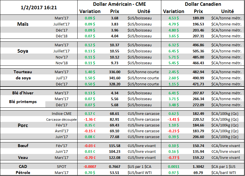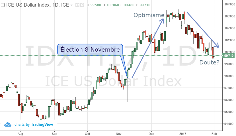Coté économique, la Réserve Fédérale (Fed) laisse les taux inchangé dans un communiqué sans aucunes surprises. Le communiqué ne nous renseigne pas sur le moment de la prochaine hausse des taux et les dirigeants s'en remettent à l'étude des statistiques économiques pour un éventuel resserement de la politque monétaire. Il faudra avoir plus d'information (et des résultats) sur les politiques de Trump concernant les baisses d'impots, les dépenses en infrastructures et les différentes renégociations d'ententes commeriales et politiques internationale. Bref, trop tot pour faire quoi que ce soit selon la Fed. Pour l'instant le dollar américain se situe sous la barre des 100 points (dollar index) et on sent une vague de doute depuis l'optmisme des élections. À suivre...