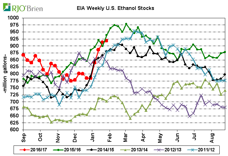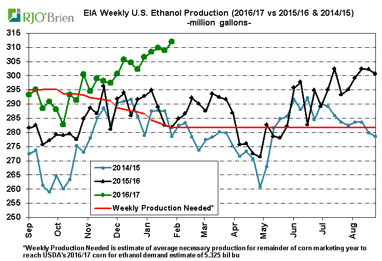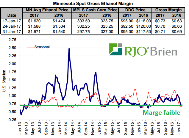L'EIA a rapporté que la production d'éthanol aux États-Unis, pour la semaine terminée le 27 janvier a atteint un nouveau record record de 1,061 million de barils / jour (312 millions de gallons / semaine) et reflète une augmentation extrêmement impressionnante de 10,6% par rapport à la même période de l'année dernier. Compte tenu de l'accumulation historique des stocks ces dernières semaines, conjuguée à des marges de production quelque peu déprimées ces derniers temps, le fait que la production continue de fixer de nouveaux niveaux record est un peu surprenant (mais très encourageant!). Néanmoins, compte tenu des récents niveaux de production bien au-dessus de la cible du bilan USDA, nous nous attendons à une augmentation de la consommation dans le prochain rapport mensuel du 9 février (semaine prochaine). Au cours des quatre dernières semaines, le gain de production d'éthanol par rapport au niveau de l'an dernier a augmenté de façon consécutive, passant de 4,6% à + 7,2% il ya trois semaines puis à 9,4% la semaine dernière pour etre à +10.6%. Une augmentation de 50-100 millions de boisseaux serait fort possible.