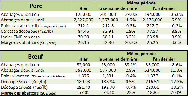L’histoire principale en ce qui concerne le porc et qui a supporté les prix la semaine dernière est la force du prix du bacon. Notre commentaire de vendredi dernier décrivait bien l’enjeu sur le marché de l’impressionnant bond du prix qui a été enregistré ces derniers jours. L’augmentation a été de près de 5.00¢/lb vendredi et le prix du bacon est maintenant de 180 ¢/lb, ce qui porte le prix de la carcasse découpée à 84.46¢/lb. Les prix de fermeture des CàT vendredi étaient de 70.33¢/lb (-0.02) sur février, 70.25¢/lb (+0.67) sur avril et 78.40¢/lb (+0.55) sur juin. Le prix cash vendredi se situait à 70.30 (+0.66) et continue de rester fort, supporté en majeure partie par le prix du bacon ce qui représente un risque à moyen terme. La marge des abattoirs est évaluée à 26.15$ la tête selon HedgersEdge. Les abattages de la semaine dernière étaient de 2.33 millions porcs ce qui représente une baisse de 1.7% comparativement à la semaine précédente, mais une augmentation de 6.8% versus l’an dernier. La production s’établit donc à 496 millions de livres, soit 7.3% de plus que l’an dernier.