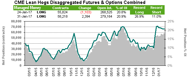 Au niveau des spéculateurs, entre le 24 et le 31 janvier, un net de 799 CàT de bœuf ont été achetés pour porter leur position à 110,074 CàT, représentant 26% des CàT existants (open interest). On note un ralentissement de l’augmentation des positions long et si la tendance se renverse, la vitesse à laquelle la position nette long baissera pourrait être assez rapide et ceci entraînerait une accélération à la baisse.