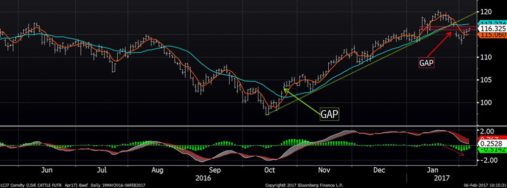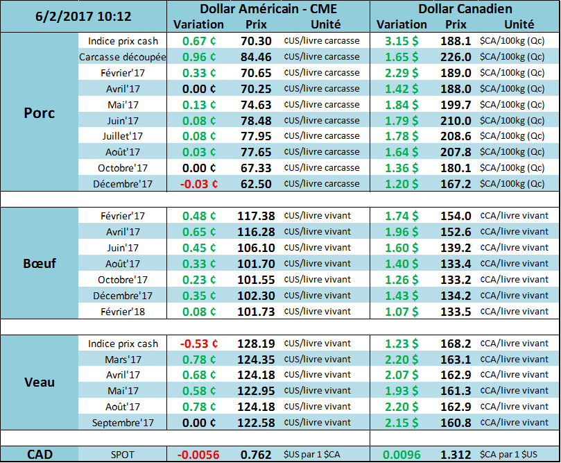 Journée relativement tranquille sur le marché du bœuf vendredi dernier. Le gros mouvement du prix sur la semaine s’est fait à l’ouverture lundi avec le gap de plus de 2.00¢/lb à la baisse qui a donné un prix d’ouverture à 115.10¢/lb. Le prix de fermeture de vendredi nous montre donc aucun changement sur la semaine alors qu’on avait 115.625¢/lb sur le contrat d’avril. C’est donc ce niveau qui se montre à être la résistance à surveiller cette semaine. Le contrat de février est demeuré inchangé vendredi à 116.90¢/lb (+0.02) et celui de juin également à 105.65¢/lb (+0.12). Les prix à la découpe ont terminé la semaine sur un ton négatif avec 191.40¢/lb (-1.61) pour le Choice et 189.93¢/lb (-0.69) pour le Select. Sur la semaine, la variation a été assez faible si on compare aux prix de jeudi dernier alors que le Choice était à 193.00¢/lb et le Select à 189.74¢/lb. Les abattages de la semaine dernière totalisent 593,000 têtes ce qui est 2.8% et 10.8% de plus de la semaine et l’année dernière respectivement. La production s’établit à 491 millions de livres, soit 10.6% de plus que la même semaine en 2016.