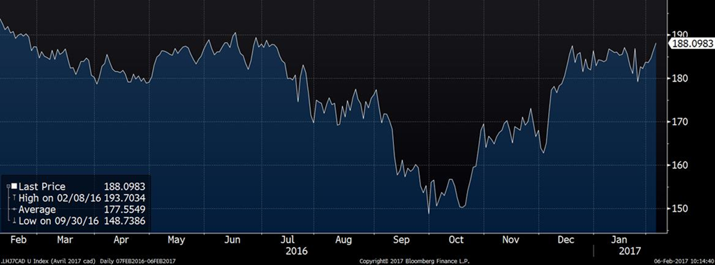 Au niveau actuel, il est possible de fermer le prix pour les livraisons de mi-avril à 188 $CA/100kg ce qui représente un sommet historique pour cette période à l’exception de 2014.