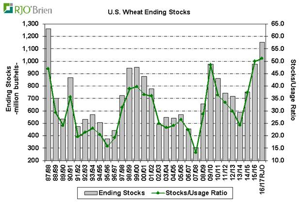 Pour le blé : Le marché du blé a vu un peu de soutien des prix aujourd'hui après l'augmentation plus importante que prévue de l'USDA de son estimation des exportations de blé des États-Unis. Alors que les meilleures projections de demande sont toujours agréables à voir, fondamentalement parlant, les révisions d'aujourd'hui ont eu peu d'impact sur la structure écrasante du bilan des États-Unis. Les inventaires sont à des sommets historique tant au niveau américain que mondial. Ceci étant dit, l’analyse technique continue de s'améliorer, et l'action d'aujourd'hui est susceptible de créer une certaine excitation parmi les observateurs.