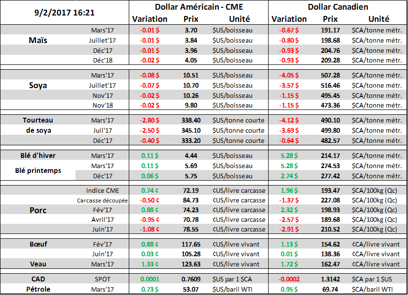 Pour le maïs : « Mince » augmentation de la consommation pour le secteur éthanol. Compte tenu de la force de la production dans les derniers mois, l’USDA aurait pu augmenter cette case d’utilisation encore plus mais USDA a préféré rester très conservatrice. Les inventaires de fin sont toujours prévus pour être très élevé à 2.320 milliard et les ratios d’utilisation à 16%. Les flux monétaires (investisseurs, spéculateurs) continuent de dominer l'activité commerciale pour le moment, comme en témoigne l'augmentation de 61,000 contrats (open interest) dans les six dernières sessions et l'augmentation de 166,000 depuis le début de l’année 2017. Avec des stocks de maïs américains de +2,320 milliards (sommet de 30 ans) ainsi que des ratios d’utilisation à 16% (sommet 10 ans), il y a beaucoup de questionnements sur la structure actuelle ou plutôt la capacité/nécessité de faire monter les prix à court terme.