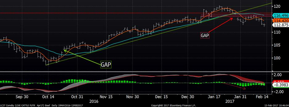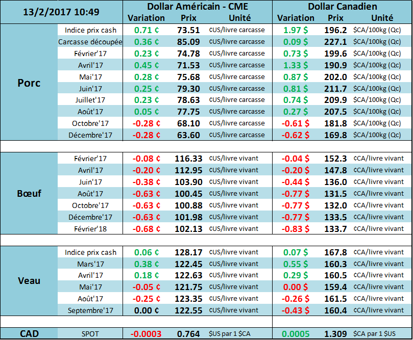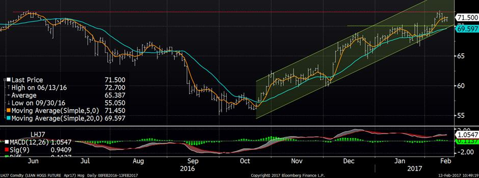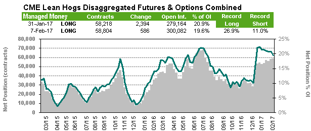 Au niveau des spéculateurs, entre le 31 janvier et le 7 février, un net de 6,486 CàT de bœuf ont été vendus pour porter leur position à 103,588 CàT, représentant 26% des CàT existants (open interest). Première semaine où les spéculateurs ont un net négatif pour l’année 2017. Il y a un risque que les spéculateurs liquident leur position dans les prochaines semaines.