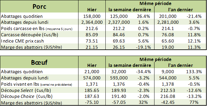 Faible augmentation vendredi sur les prix des contrats à terme alors qu’on a vu en moyenne 0.30¢/lb à la hausse. Le prix du contrat de février, qui vient à expiration demain, a connu une forte augmentation la semaine dernière grâce à la force du prix cash. En tout, c’est plus de 4.00¢/lb entre l’ouverture de lundi à 70.275¢/lb et la fermeture de vendredi à 74.55¢/lb. L’indice du porc à la CME, le prix cash, a gagné plus de 3 points la semaine dernière alors qu’il était évalué à 73.51 vendredi dernier versus 70.30 le vendredi précédent. Les niveaux des autres contrats à terme sont de 71.08¢/lb sur avril et de 79.05¢/lb sur juin. Le prix de la carcasse découpée était également positive vendredi à 85.09¢/lb (+0.36). L’augmentation est pas mal plus faible sur cet indice alors que le vendredi précédant le niveau était de 84.46¢/lb. Grosse semaine de production encore avec plus de 2,364,000 têtes abattues versus 2,327,000 la semaine dernière donc 1.6% d’augmentation. L’augmentation est de près de 3.8% sur l’an dernier.