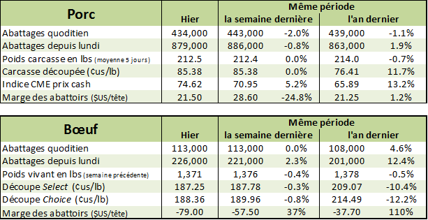 Hausse des prix hier après la publication matinale du prix des découpes, mais la fermeture s’est fait plus sur une note baissière alors que le prix a redescendu de 0.50¢/lb dans la dernière heure. Ceci est dû en autre au 2e rapport de la journée du prix des découpes. En effet, le rapport publié à 10:30 AM (heure de l’est) était très positif pour chaque découpe et on avait une augmentation de 1.35¢/lb sur l’ensemble de la carcasse découpée. Le prix du porc a donc fortement monté pour atteindre près de 2.00¢/lb de hausse, effaçant la perte de la journée précédente. Le deuxième rapport sur la découpe qui est publié à 3 :00 PM (heure de l’est) est venu contrebalancer le tout pour nous indiquer un prix de la carcasse découpée à 85.38¢/lb (+0.24) seulement. Par exemple, le prix du bacon à 9 :30 AM était à 183.95¢/lb (+2.83) versus 180.92¢/lb (-0.51) à 3 :00 PM. Quand même une différence de 3.34¢/lb d’un rapport à l’autre. Voici la différence entre les prix du matin et ceux de l’après-midi hier. (NB : les heures ici-bas sont selon l’heure centrale)