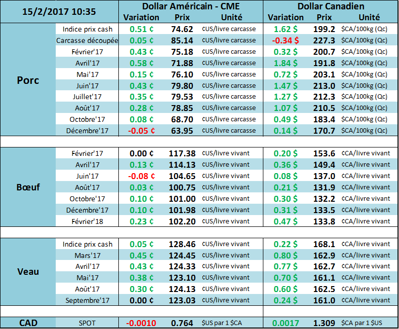 Journée positive sur le marché du bœuf hier avec des gains de 0.10 et 0.67 sur les découpes pour atteindre 188.36¢/lb pour le Choice et 187.25¢/lb pour le Select. Les CàT ont donc suivi cet élan avec plus de 1.00¢/lb de gain sur les prochaines expirations. Le contrat de février a terminé à 117.38¢/lb (+1.45), celui d’avril à 114.00¢/lb (+1.47) et celui de juin à 104.73¢/lb (+1.17). Les prix du veau d’embouche ont également connu de bonnes hausses alors que le contrat de mars était +2.17 à 124.00¢/lb et celui d’avril +1.92 à 123.90¢/lb. Nous aurons aujourd’hui plus d’indication sur le prix cash avec les transactions effectuées via le Fed Cattle Exchange aux États-Unis.
