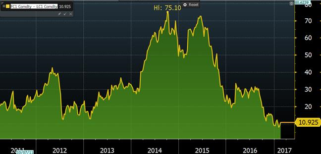 Les prix du bœuf et du veau se sont transigés dans des directions inverses hier, l’écart entre le contrat d’avril de bœuf et de veau est de 10 ¢/lb présentement. Malgré les fluctuations d’hier, on note que l’écart entre les prix des veaux et des bœufs s’est grandement rapproché depuis 2 ans alors que nous étions à 75¢/lb d’écart. L’écart était de seulement 7 ¢/lb la semaine dernière ce qui était le plus faible écart en 7 ans. Cela joue en faveur des parcs d’engraissement puisque le coût de remplacement du troupeau a nettement diminué depuis 2014-15.