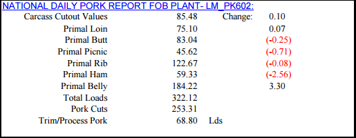 Journée négative hier sur les contrats à terme du porc. On se dirige dans cette même direction ce matin malgré l’ouverture des marchés qui s’est fait 0.30¢/lb plus haut que la fermeture d’hier. Donc, les prix d’ouverture étaient de 71.075¢/lb sur avril, 79.225¢/lb sur juin et 78.75¢/lb sur août. Concernant le prix de la carcasse découpée, la situation hier a été semblable à celle de lundi alors que c’est seulement le prix du bacon qui a maintenu la valeur de la carcasse sur la journée. Concernant le prix cash, l’indice s’est établi à 75.31 (+0.69) hier ce qui servira du prix de règlement pour le contrat à terme de février. Voici donc le sommaire du prix de chaque coupe :
