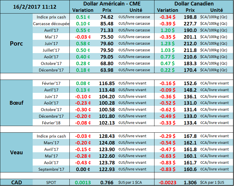 Les contrats à terme étaient en baisse hier sur la journée. Le contrat de février a terminé à 116.78¢/lb (-0.60), celui d’avril à 113.35¢/lb (-0.65) et celui de juin 104.30¢/lb (-0.42). Au niveau du prix des découpes, légères diminutions alors que le prix du Choice se situait à 188.34¢/lb (-0.02) et celui du Select à 187.15¢/lb (-0.10). Le marché tente toujours de trouver une direction dans laquelle se lancer depuis les rapports de la fin janvier qui étaient plutôt négatif pour les prix. En revanche, le prix cash est toujours fort tel que démontré par les transactions effectuées hier sur le Fed Cattle Excahge, les transactions tournaient autour de 119.00¢/lb, légèrement sous les 120.00¢/lb de la semaine dernière. Vous pouvez consulter les données sur le lien suivant : http://www.fedcattleexchange.com/page/SaleResults. Au niveau du veau d’embouche, les contrats à terme ont été légèrement positifs à 124.28¢/lb sur mars (+0.27) et à 124.05¢/lb (+0.15) sur avril.