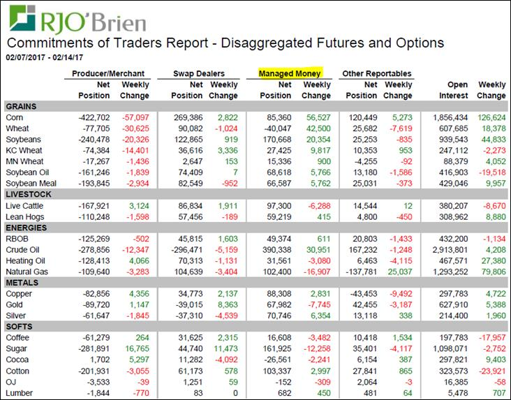 Selon le rapport CFTC d’aujourd’hui, on constate qu’en le 7 et 14 février, les investisseurs continuent d’acheter massivement des commodités agricoles. En général, les fonds d’investissement sont devenus optimistes sur les prix des commodités pour seulement la deuxième fois depuis 2012. À la suite des multiples recommandations des banques et courtiers, les gestionnaires de portefeuilles surpondèrent les commodités dans l’allocation des portefeuilles depuis le début de l’année 2017. Maintenant, on voit le résultat : les fonds d’investissement ont une position nette acheteur dans toutes les commodités sauf le blé (-40,000 CàT) et le cacao (-26,500 CàT). En ce qui a trait à la semaine dernière, ils ont acheté énormément de grains avec plus de 140,000 CàT dans les céréales et soya. À l’inverse, on voit que les producteurs et commerçants ont vendu pour un volume similaire.