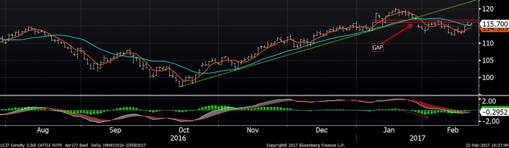 Concernant le veau d’embouche, on est venu toucher au niveau où le contrat sur mars se trouvait avant le gap créé à l’ouverture le 30 janvier. Au niveau technique, on voit une résistance sur ce niveau. Le haut touché hier se trouvait à 125.65¢/lb et le bas connu juste avant ce gap était à 126.85¢/lb.
