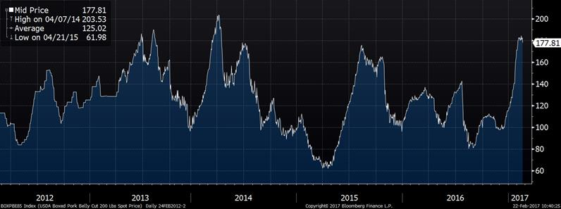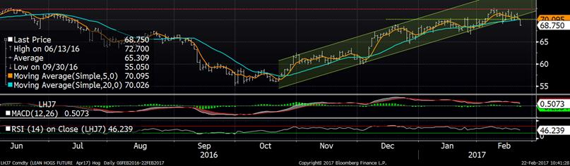 Sur le marché du porc, la nouvelle de la journée était la baisse que le prix du bacon en après-midi. On parle d’une baisse de 7.48 en moyenne pour la journée, donc -4% sur la journée. C’est une baisse significative étant donné du prix anormalement élevé à cette période de l’année alors que le prix du bacon avoisine des records historiques. Il est donc important de voir si cet élan prendra de l’ampleur aujourd’hui. Évidemment, ça donne un bon coup à la baisse sur les marché à terme ce matin. À l’ouverture ce matin, on a connu une baisse de 1¢/lb instantanément et ça s’est poursuivi par la suite. Au niveau technique, les contrats d’avril et juin sont venus briser le canal haussier entamé à la fin octobre. C’est donc à suivre de près si la « bulle du bacon » est au début de sa fin. Notre meilleure indication sera les prix de fermeture alors que tous les chiffres de la journée seront connus. Donc, on niveau des prix, la carcasse découpée était évaluée à 84.54¢/lb (-0.92) et le prix cash à 77.24 (+0.17).