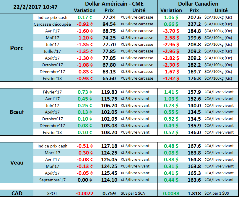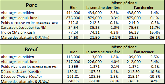 Journée positive hier sur le marché du bœuf. Le contrat de février a connu un bon gain grâce à la force du prix cash. Le marché nous démontrait cependant un peu de pessimisme sur les prix d’été alors qu’on s’attend à beaucoup de bœufs à la sortie des parcs d’engraissement. Les prix de fermeture hier sur les contrats à terme étaient de 119.10¢/lb (+1.17) sur février, 115.30¢/lb (+0.37) sur avril et 105.95¢/lb (+0.57) sur juin. Le prix des découpes était positif pour le Choice à 191.81¢/lb (+0.90) et négatif pour le Select à 189.81¢/lb (-0.59). Légère amélioration des marges des abattoirs alors qu’elles sont évaluées à -58.55$ la tête versus -79.00$ la semaine dernière. Le marché poursuit la même lancée aujourd’hui avec une hausse de prix accentuée sur l’échance de février et avril, alors que les contrats pour l’été prochain sont inchangés.