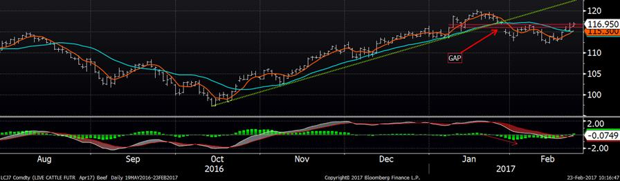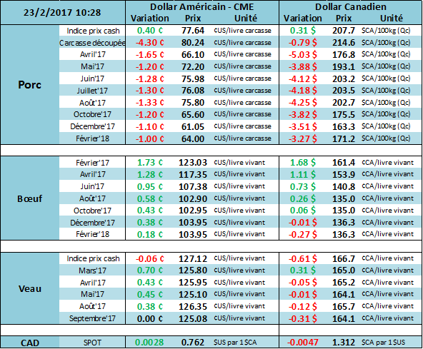 Journée assez intéressante hier sur les marchés bovins et porcins. Tout d’abord, les bonnes données venant du marché cash aux États-Unis a fait bondir le prix du contrat à terme de février de 2.20 ¢/lb. On se trouve dans la période de livraison des CàT, donc les limites quotidiennes seront à 5¢/lb pour lundi et mardi prochain (2 jours avant l’expiration), il serait possible d’apercevoir de grandes fluctuations d’ici l’expiration du contrat le 28 février. C’est pourquoi on focus davantage sur la variation du contrat d’avril afin de voir la réaction du marché à court terme en réponse aux résultats d’hier. En effet, les transactions se trouvaient 4-5¢/lb plus élevées que la semaine dernière à 123-124¢/lb dans les régions comme le Texas et le Nebraska (Voir les résultats ici). Ce qui a donc donné un élan au contrat de terme d’avril alors qu’à un certain point dans la journée on se trouvait à près de +2¢/lb, mais pour finalement terminer la journée à 116.075¢/lb avec + 0.77 sur la journée. Le prix des découpe était également un facteur positif sur la journée alors que le Choice affichait 194.53¢/lb (+2.72) et le Select 190.81¢/lb (+1.00). Le CàT du veau d’embouche ont également poussé dans la même direction alors qu’on avait +0.55 sur mars à 125.10¢/lb et +0.40 sur avril à 125.53¢/lb.