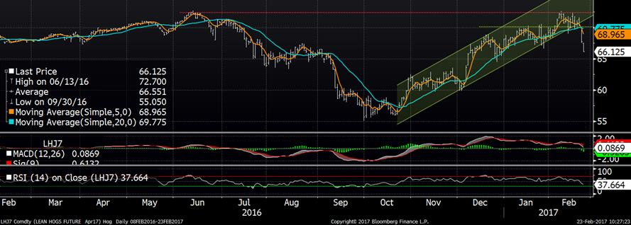 Comme on le disait dans notre lettre d’hier soir, le prix du bacon a connu une solide baisse depuis mardi midi avec -0.32¢/lb. C’est vrai qu’on a déjà vu une telle situation se produire l’été dernier et les années précédentes, mais c’était déjà une situation plutôt anormale de voir du bacon à presque 2 $US/lb en février. Il ne serait pas surprenant de voir une autre bonne correction du prix du bacon aujourd’hui puisque historiquement, les chutes du prix du flanc de porc sont brusques. Le prix de la carcasse découpée a évidemment pris un coup hier alors qu’on avait -4.30 ¢/lb sur la journée pour atteindre 80.24¢/lb. Donc, sans surprise, le prix des CàT est venu refléter cette diminution des prix cash avec près de -2.00¢/lb en moyenne sur les différents mois. Le CàT d’avril a terminé la journée à 67.75¢/lb (-2.60), mai à 73.40¢/lb (-2.05) et juin à 77.25¢/lb (-1.80). Sans trop vouloir se répéter, on doit quand même noter qu’au niveau technique, on a brisé le canal haussier sur le prix du CàT d’avril. La baisse se poursuit ce matin avec le CàT d’avril qui est rendu à 66.1 ¢/lb (-1.7) et les mois d’été qui baisse de 1.25 ¢/lb en moyenne.