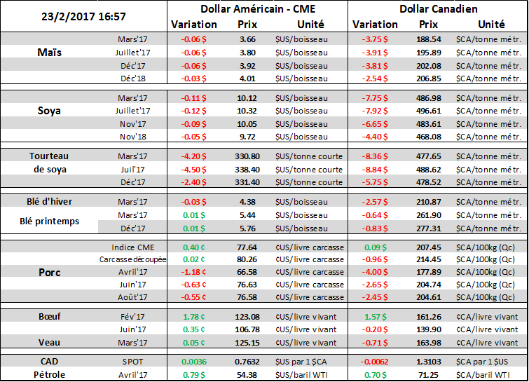 À 15h00, c’était la publication des inventaires surgelés en date du 31 janvier. Les inventaires de porc étaient de 527 millions livres ce qui est 16% de moins que l’an dernier ainsi que la moyenne 5 ans. Les stocks de jarret, jambon et longe ont reculé de la même envergure que les inventaires totaux. Sans surprises, les inventaires de bacon étaient très faibles à la fin janvier à seulement 14 millions de livres ce qui représente un recul de 4M depuis décembre. C’est moins que le quart des inventaires de flanc qu’on avait il y a 1 an ce qui explique assez bien les prix quasi-record. Aujourd’hui, le prix du bacon est resté inchangé à 1.5 $US/lb après un chute de 18% en 2 jours.