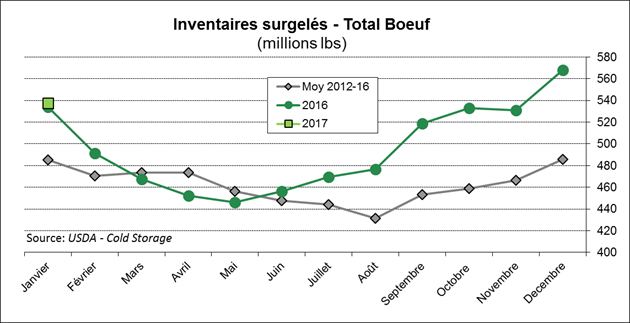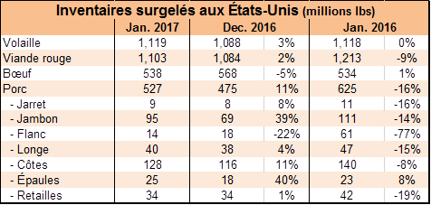Les inventaires surgelés de bœuf qui étaient extrêmement élevés en décembre, ont diminué de 5% pour aller rejoindre le même volume que l’an dernier à 538 M livres. Ça reste historiquement élevé comme inventaires surgelés. En somme, les inventaires surgelés de viande rouge étaient 9% plus faible qu’en janvier 2016 (grâce au porc), mais demeure au-dessus de la barre du 1 milliard de lbs à 1.1 B. Pour la volaille, les réserves sont aussi élevées à 1.1 milliard ce qui est identique à l’an dernier. Avec 71.7 millions de lbs d’ailes de poulet, les américains étaient prêts pour le Superbowl!