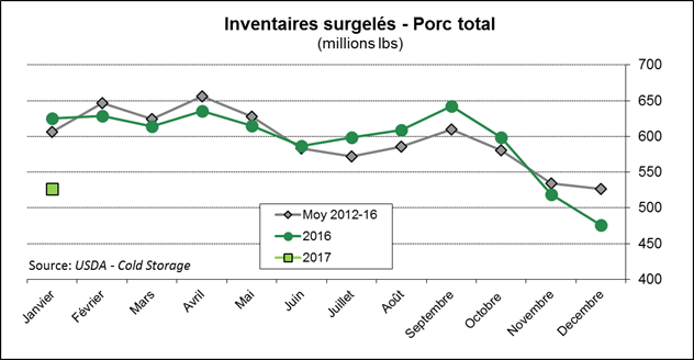 · Inventaires surgelés de porc : 527 M lbs, soit 16% de moins que l’an dernier