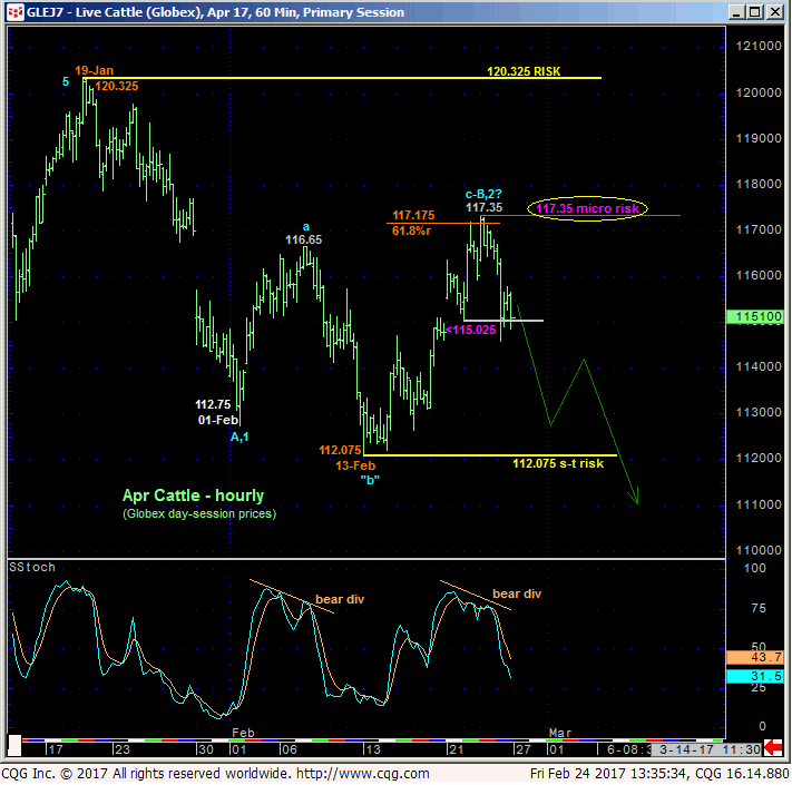 Rapport Cattle on Feed, qui vient tout juste d’être publié à 15h. Encore beaucoup de placements en janvier si on compare avec l’an dernier mais tout de même moins qu’en décembre. Donc, la production s’annonce toujours assez élevée pour les prochains mois. On peut donc anticiper des prix moins élevé à venir avec l’augmentation du nombre de bœufs dans les parcs d’engraissement. Plus bas, vous verrez un graphique montrant une analyse du côté technique sur le marché du bœuf. On voit que les prochains niveaux importants à surveiller sont de 112.075¢/lb et 117.35¢/lb.
