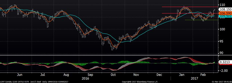 Par ailleurs, l’indice de la confiance des consommateurs américains en février a atteint 114.8 ce qui est le plus haut niveau depuis 2001… Make America Great Again! La confiance des consommateurs est un facteur important pour la demande des coupes de bœufs ainsi que des ventes en restaurant.
