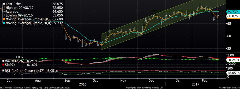 Le marché du porc se stabilise au tour de 68 ¢/lb sur avril. Le marché attend d’avoir plus d’information sur la descente du prix cash laquelle s’accélère. Le prix des ventes de jeudi était de 77.17 (-0.48), vendredi de 76.44 (-0.72) et lundi de 75.18 (-1.26). D’ici midi, nous devrions avoir le prix cash d’hier ce qui va surement influencer le cours de la journée. Cependant, c’est déjà inclus dans le marché à terme que le prix cash descendra avec l’énorme écart entre de cash et les prix dans 6 semaines. Au moins, la valeur de la carcasse découpée a légèrement augmenté hier ce qui support un peu le prix du porc. À l’exception de la longe, toutes les coupes étaient dans le vert, permettant un gain de 1.49 ¢/lb à 81.94 ¢/lb pour l’ensemble de la carcasse découpée.
