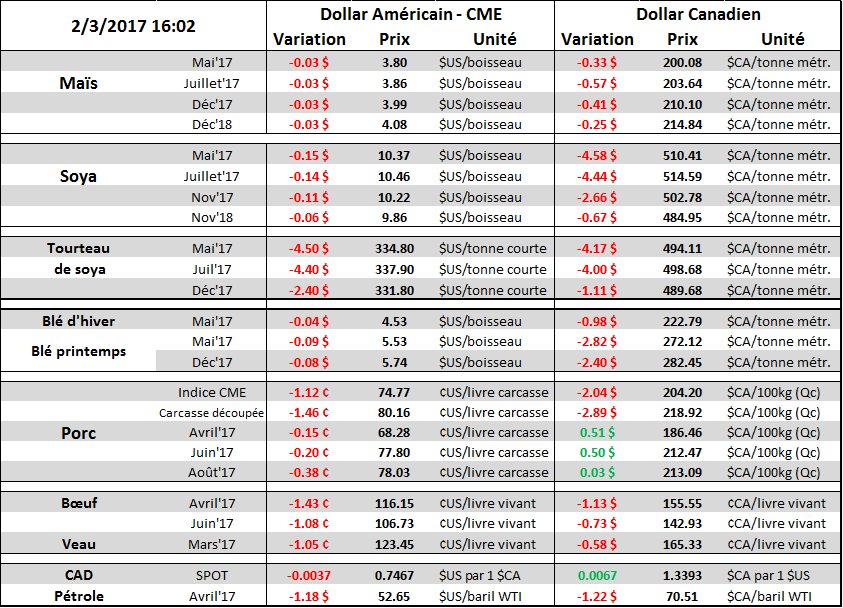 Bien que les livraisons soient en retard, le soya est là et sera disponible prochainement. Une fois que les problèmes de logistiques seront surmontés, il faut s’attendre à ce que le Brésil inonde le marché ce qui se confirme par Informa Economics. La firme de recherche a émis de nouvelles projections sur la récolte brésilienne à 108 millions de tonnes de soya comparativement à leur estimés du mois dernier de 106.5 MTM et de l’USDA à 104 MTM. Les prévisions de la récolte de maïs sont augmentées de 89 à 91 MTM, bien au-dessus des chiffres de l’USDA à 86.50 millions de tonnes. Concernant l’Argentine, les estimés sont inchangés à 55 MTM de soya (versus 55.5 MTM pour l’USDA) et 35.2 MTM de maïs (versus 36.5 MTM pour l’USDA).