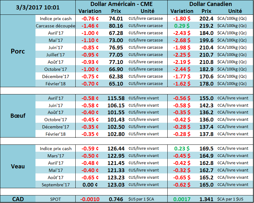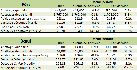 Le marché du bœuf a terminé la journée d’hier à la baisse pour une deuxième journée consécutive. Le CàT d’avril a glissé de 1.43 à 116.15 ¢/lb, juin de 1.08 à 106.73 ¢/lb et août de 1.05 à 101.95 ¢/lb. La faiblesse des prix provenait du marché global des matières premières et rien de particulier au marché bovin, l’Indice Bloomberg Commodity a diminué de 1.5%. Dans la région des plaines américaines, des prix cash à 125 ¢us/lb ont été rapporté ce qui démontre que les abattoirs continuent de miser fort en raison de leur marges qui sont redevenues positives à +9.6 $US/tête. Le Choice était à la hausse de 1.67 ¢/lb et le Select de 0.85, gardant la tendance des dernières semaines.