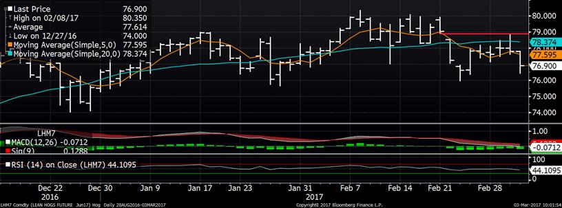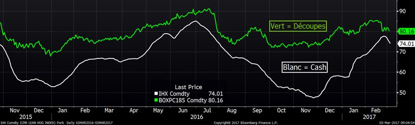 En début de session, le prix du porc a grimpé à son plus haut niveau en plus d’une semaine, mais a tout de même terminé la journée dans le rouge. La pression du prix cash et des découpes ont eu le dessus. L’indice CME du prix cash est publié à 74.01 ¢/lb en baisse de 0.76. On parle donc d’une baisse de 3.7 ¢/lb ces 5 derniers jours. Concernant la carcasse découpée, sa valeur est à son plus bas depuis le 24 janvier à 80.16 ¢/lb (-1.46) et le recule d’hier provient de la chute de 9.4 ¢/lb du prix du bacon à 143.9 ¢/lb qui est également à son plus bas niveau depuis le 24 janvier. Ça démontre bien que le prix du bacon mène le marché du porc depuis le début de l’année lequel a établi des records historique en février mais vient de passer en-dessous des prix de 2014.