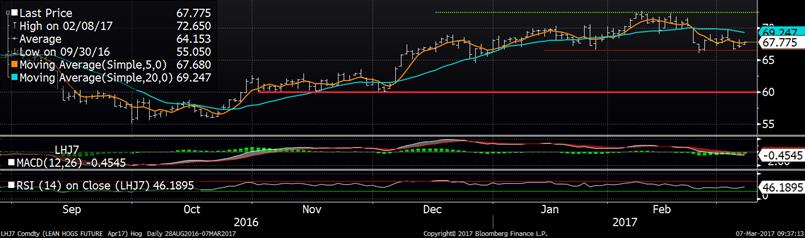 Le prix du porc a terminé la journée d’hier à la hausse et continue de s’apprécier ce matin, principalement grâce au prix des découpes qui ont monté lundi. La carcasse découpée a gagné 1.9 ¢/lb à 82.53 avec un léger gain pour toutes les coupes et de plus importants gains pour le bacon (+7.25 à 145.11) et l’épaule (+2.73 à 95.06). Le contrat à terme d’avril a terminé la journée à 67.175 ¢/lb (+0.43) pendant que le contrat de juin gagnait 0.3 ¢/lb à 76.75. À court terme, il ne serait pas surprenant que le marché boursier demeure stable en attendant de voir où la baisse du prix cash cessera. L’indice CME du prix cash est à 72.92 ce matin (-0.46) et les marges des abattoirs remontent à 20 $US/tête.