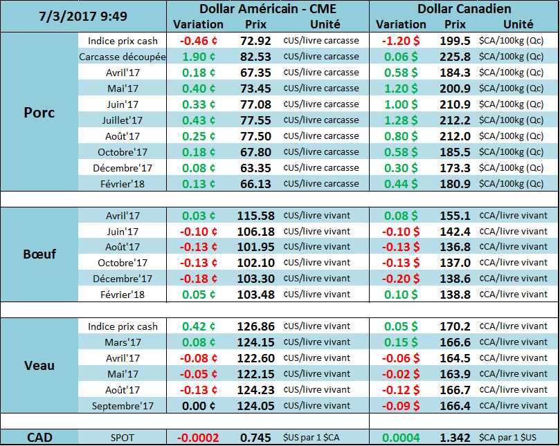 Hier, c’était la première journée de transaction pour le CàT de bœuf sur juin 2018. À l’ouverture, le prix était évalué par la Bourse à 101.68 ¢/lb ce qui était particulièrement élevé versus le mois d’avril 2018 qui était seulement 1 ¢/lb plus cher. Avec ce petit écart, ça n’a pas pris de temps que le CàT sur juin 2018 a atteint « limit down » avec un volume de 7 contrats à ce niveau. Ce matin, le prix de juin 2018 se transige à -1.5 ¢/lb alors que les autres échéances sont inchangées. De la sorte, l’écart entre avril et juin 2018 est rendu de 5¢/lb ce qui reflète une situation plus normale qu’à l’ouverture d’hier.
