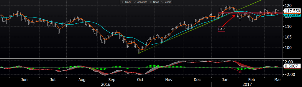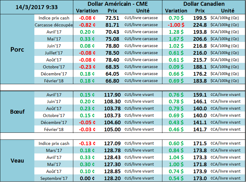 La montée du prix du bœuf depuis l’automne rend les traders nerveux sur la possibilité que la demande des consommateurs ralentisse ce printemps au moment où l’offre serait abondante. Le prix des CàT d’avril est toujours bien en dessous des valeurs au comptant dans la prévision que le cash amorce une baisse dans les prochains jours/semaines (chose que les traders anticipent depuis déjà un bon moment sans trop de résultat). La production de bœuf pour le deuxième trimestre de 2017 est prévu être en hausse de 520 millions de livres vs Q1 et en hausse de 252 millions de livres vs la même période l’an dernier. Les futures d’avril ont débuté la semaine avec un discount de 6.40$ sur le cash, ce qui maintient le prix des contrats à terme (vs juin à 108) et pousse les transformateurs à hausser les bids pour sécuriser l’approvisionnement.