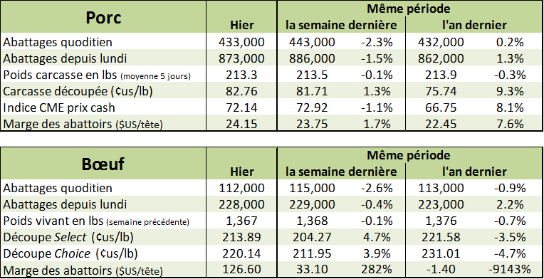Les contrats d’avril ont clôturé en forte baisse hier devant la tempête hivernale qui ralenti considérablement la demande. L’abattage à 112k amène un total de 228k sur la semaine en baisse vs la semaine passée (229k) mais en hausse vs l’an dernier (229k).