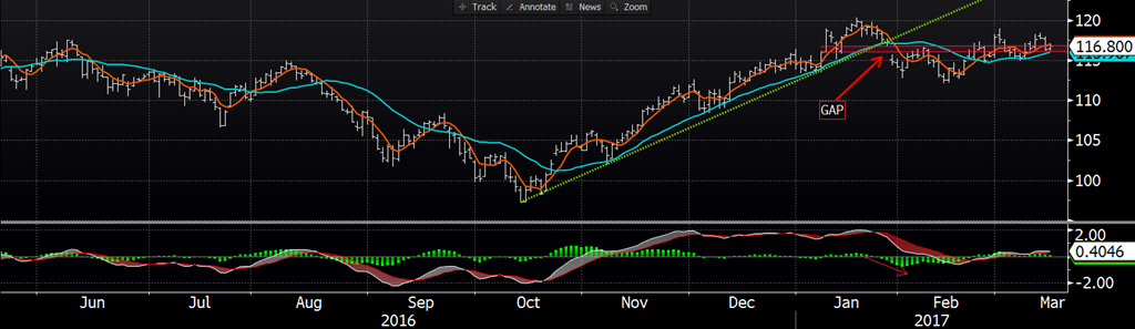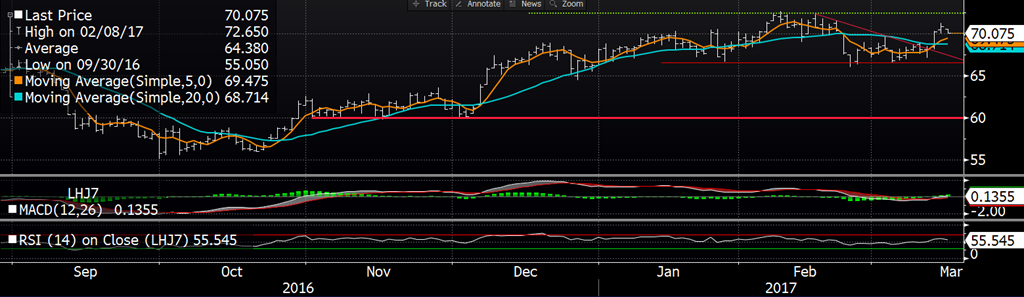 À moins que la grippe aviaire ne se propage aux USA dans la forme qui peut atteindre les humains, les cas de grippe en Alabama et Tennessee ne feraient que ralentir les exportations d’œufs et volaille et laisse donc un surplus de viande sur le marché domestique. Le résultat est une force négative pour le marché, du moins pour l’instant. Les traders sont toujours nerveux quant à l’abondance prévue pour le printemps face à une demande possiblement molle pour le bœuf. On s’attend à voir une augmentation de 520 millions de livres de viande pour Q2-2017 en nette hausse sur le trimestre précédent et l’an passé. Par contre, le cash est encore très positif à 124-126$ et nous allons surveiller l’encan électronique aujourd’hui pour voir de quelle manière les acheteurs réagissent – soutiendront ils les prix ou vont il baisser les bids?