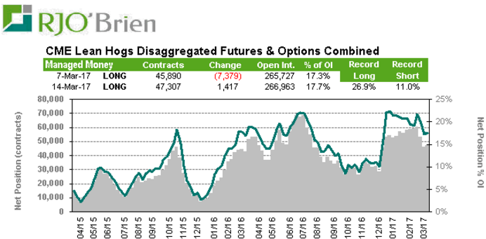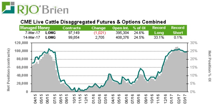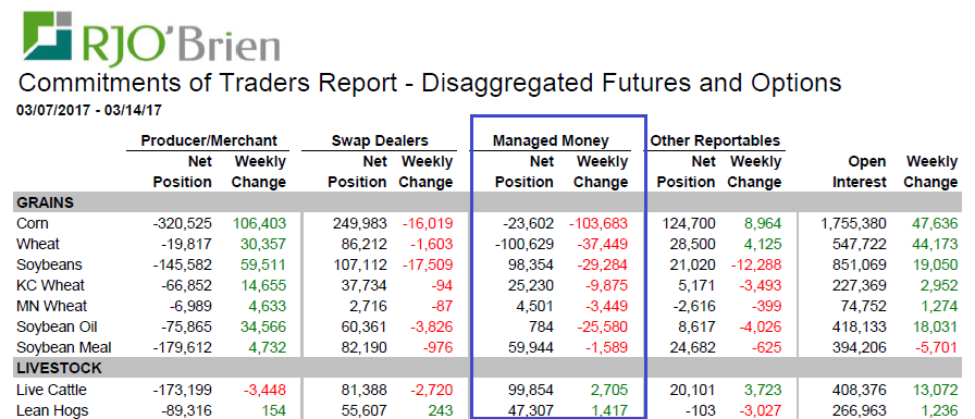 Entre le 7 et 14 mars, les fonds ont massivement vendu le grain, dont le maïs qui a vu la position acheteur passer à vendeur de 23k contrats. Coté de l’élevage les fonds maintiennent et ajouter sur la position longue.