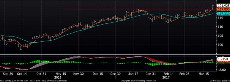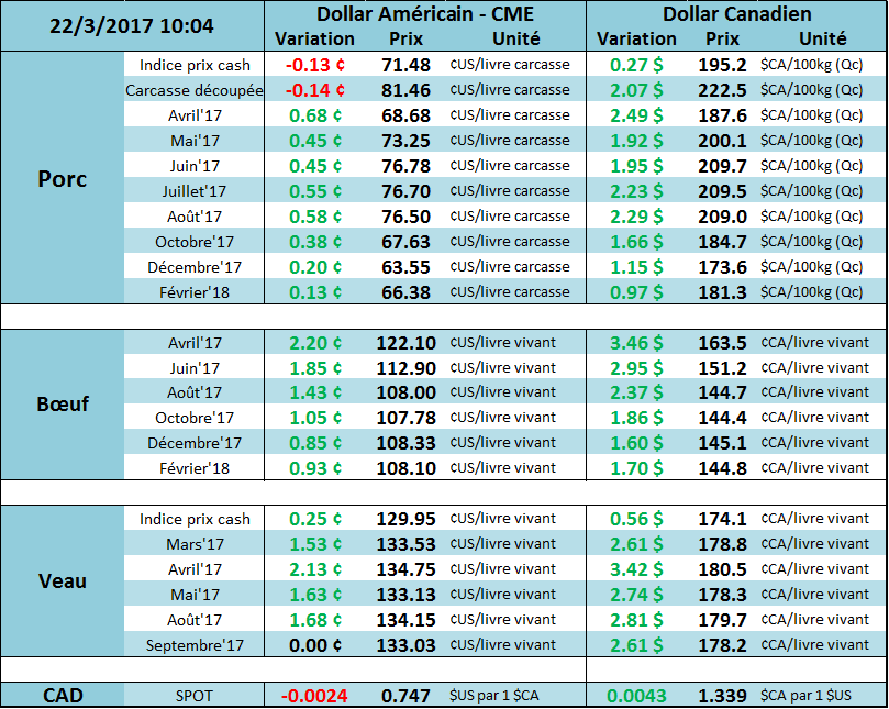 Le marché à termes a poursuivi son rallie puisque les prix restent inférieur au marché cash. Le CàT d’avril a terminé la journée d’hier à 119.90 ¢/lb (+1.00), juin à 111.05 ¢/lb (+1.25) et août à 106.68 ¢/lb (+0.92). Ce matin, les prix sont à la hausse d’environ 2¢/lb, on a donc percé les résistances sur toutes les échéances, c’est techniquement positif. Aujourd’hui, c’est l’encan électronique qui commencera à 11h00 et possiblement que ce sera l’évènement qui confirmera la force du prix cash. Le fondamental n’a pas tellement changé depuis les dernières semaines, les prix des découpes restent très forts, finissant la journée d’hier à des niveaux records pour 2017 à 224.93 ¢/lb (+1.17) pour le Choice et 215.41 ¢/lb (+1.44) pour le Select. La marge des abattoirs est estimé à +116 $US/tête selon HedgersEdge, en baisse depuis la semaine dernière alors qu’on était à 127 $US.