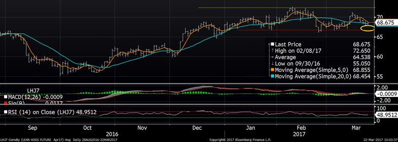 Le marché à terme du porc a baissé pour une 5ème journée consécutive sur l’échéance d’avril, totalisant une baisse de 3 ¢/lb sur cette période. Techniquement, la zone 66.50 – 67.00 ¢/lb semble être un bon support sur avril, de plus que le prix cash se stabilisait hier autour de 71.5 ¢/lb. À l’inverse, le prix des découpes continue de baisse tranquillement, présentement à 81 ¢/lb. Le prix du bacon est rendu à 133.6 ¢/lb ce qui est le plus faible niveau depuis l’explosion du prix en janvier. Au moins, le prix du jambon se maintient au-dessus du 60 ¢/lb, présentement à 62 ¢/lb et devrait rester fort ces prochaines semaines grâce aux commandes reliées à la fête de Pâques qui est le 3ème dimanche d’avril cette année.