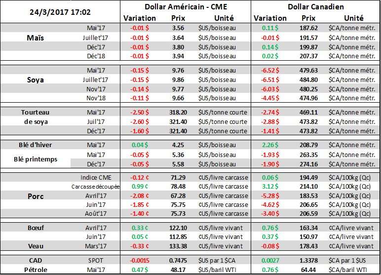 Les prix des grains ont continué leur petite tendance baissière sous la pression de la récolte brésilienne qui commence à sortir du pays. De plus, avec l’industrie des viandes au Brésil qui est banni de plusieurs pays après le scandale sur la viande avariée, le prix des viandes chute là-bas ce qui devrait faire baisser la consommation de moulée à moyen terme, laissant plus de grains à l’exportation. Présentement, les estimés sur les exportations brésiliennes de maïs augmentent et pourraient rejoindre l’année record de 2016/17. L’USDA prévoyait dans son dernier rapport que les exportations brésiliennes allaient s’établir à 31 millions tonnes après une augmentation de 3 millions versus les chiffres de février. Maintenant, on parle d’exportation qui serait entre 34 et 35 millions tonnes à cause de la baisse de consommation. D’ailleurs, le prix du maïs brésilien à l’exportation au port de Paranagua a baissé de près de 3% cette semaine. À Chicago, le prix est rendu à son plus bas niveau depuis 3 mois, à 3.80 $US/boisseau, très près des bas des 6 derniers mois qui représente le support technique. Concernant les intentions d’ensemencement, le sondage fait auprès des 34 firmes de recherche (dont RJO), la moyenne des estimés est à 90.9 millions d’acres ce qui serait 3.1M de moins que l’été dernier.
