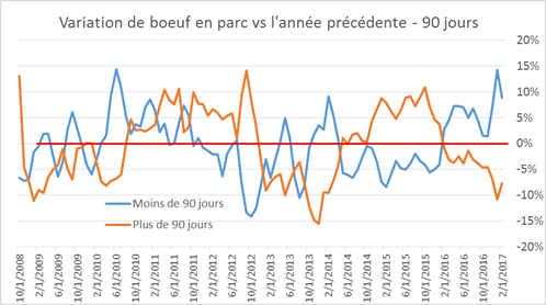 Lorsqu’on compile les données, on réalise que la « pénurie » de bœufs devrait prendre fin sous peu. Bien qu’à la fin février, il y avait 11% moins de bœufs qui étaient en parc depuis plus de 90 jours comparativement à l’an dernier (indication de l’offre à court terme), ce chiffre a diminué à -8% pour la fin février. Aussi, il y a 9% plus de bœuf que l’an dernier qui sont en parc depuis moins de 90 jours. Autrement dit, il y a autant de bœuf en parc qu’en février 2016, mais ils sont en moyenne moins vieux. Cela explique l’énorme écart entre les prix d’été et le prix cash actuellement.