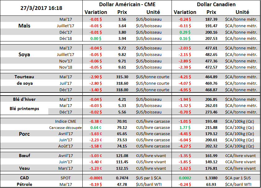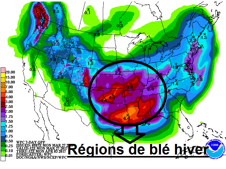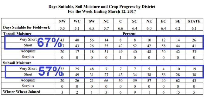 Pour le maïs et le soja, les marchés attendent impatiemment l’information de l’USDA sur les surfaces 2017. D’ici la sortie du rapport ce vendredi midi, les marchés seront possiblement sur les lignes de côté alors que tout le monde attend de voir l’info. Par contre du côté du blé d’hiver la saison est lancée et le bal des conditions des cultures est amorcé. Le marché s’inquiétait des conditions des cultures qui étaient moins bonnes que l’an passé à la sortie de l’hiver à cause des conditions sèches au Kansas, Oklahoma et Arkansas notamment. Par exemple au Kansas, le plus gros état producteur de blé d’hiver, l’information en date du 12 mars montrait un déficit d’eau inquiétant.