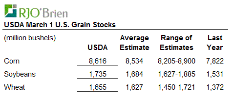 Maïs : Il y a en stock 8.62 milliard de boisseaux en date du 1er mars, soit une augmentation de 10.2% par rapport à l’an passé et suggère que l’USDA surestime la consommation pour l’élevage de possiblement 100 millions de boisseaux.