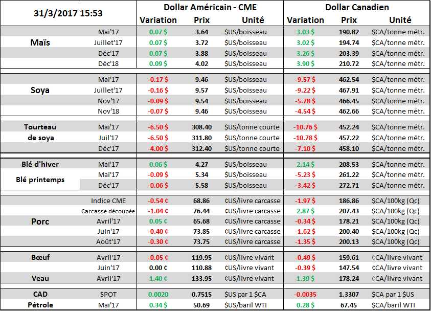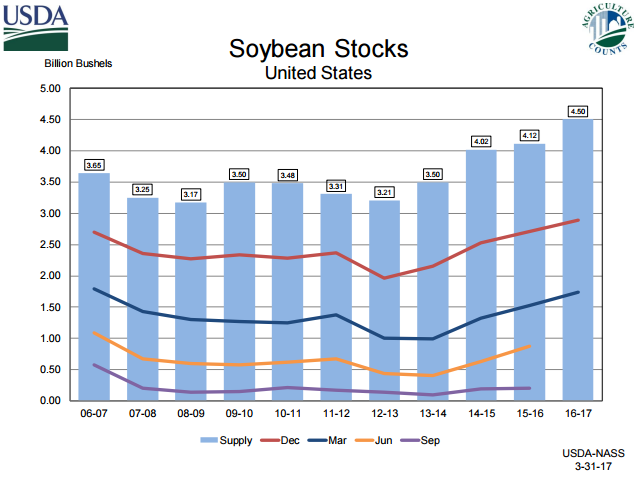 Soja : Stock au 1er mars évalué à 1.73 milliard en hausse de 13% par rapport à 2016 et 51 millions de plus que la moyenne des estimés. C’est une surprise bearish et implique un résiduel très élevé qui suggère que soit 1) la récolte 2016 est plus grosse ou que la qualité est meilleure. Peu importe, le rapport WASDE devrait corriger la situation et devrai réduire le « résiduel » de 15-20 million (fait augmenter les stocks de report).