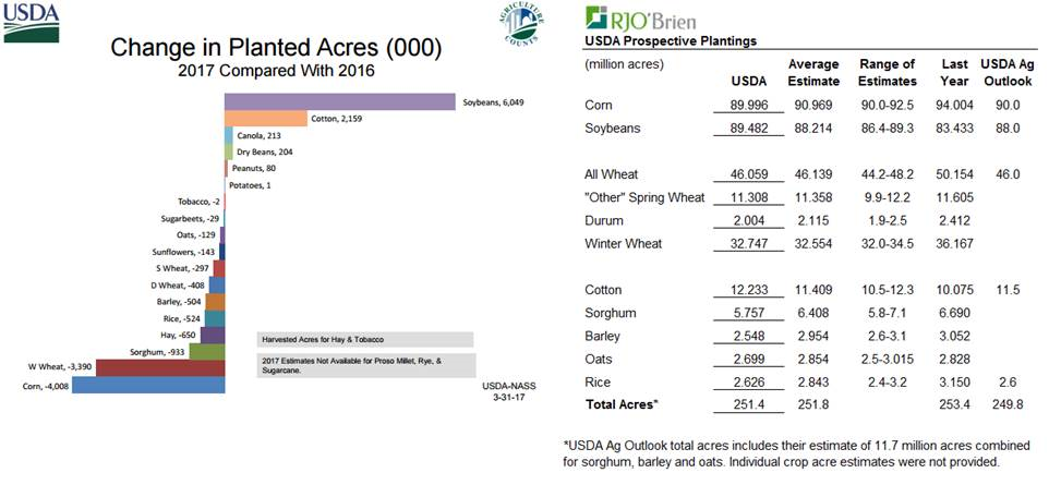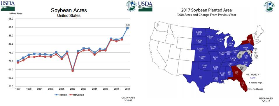 · Plus de soja : 89.5 millions d’acres vs 83.4 2016 et 88M « prévu »